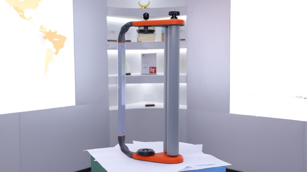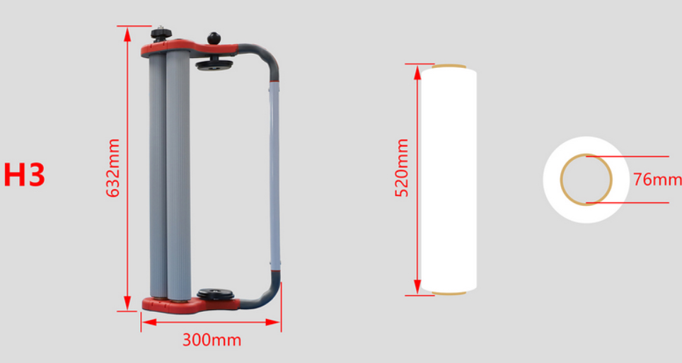 The design of the stretch film dispenser HOLD3 integrates a sturdy metal frame finished with a rust-resistant coating to withstand challenging industrial conditions. The adjustable height accommodates film rolls with widths between 12 and 20 inches, ensuring broad compatibility. Handles are ergonomically constructed with soft foam padding to improve grip and user comfort. The spindle accepts standard 3-inch film cores, simplifying roll replacement and supporting most commercially available stretch films. This versatility ensures that the HOLD3 accommodates different packaging needs without requiring additional tools or accessories.